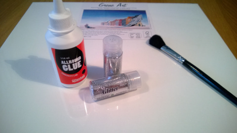 Let dry following instructions on glue bottle. After it has dried completely, shake off any excess glitter and clean the edges, if necessary. Tipp: Apply a thin layer of hair spray to hold glitter in place.