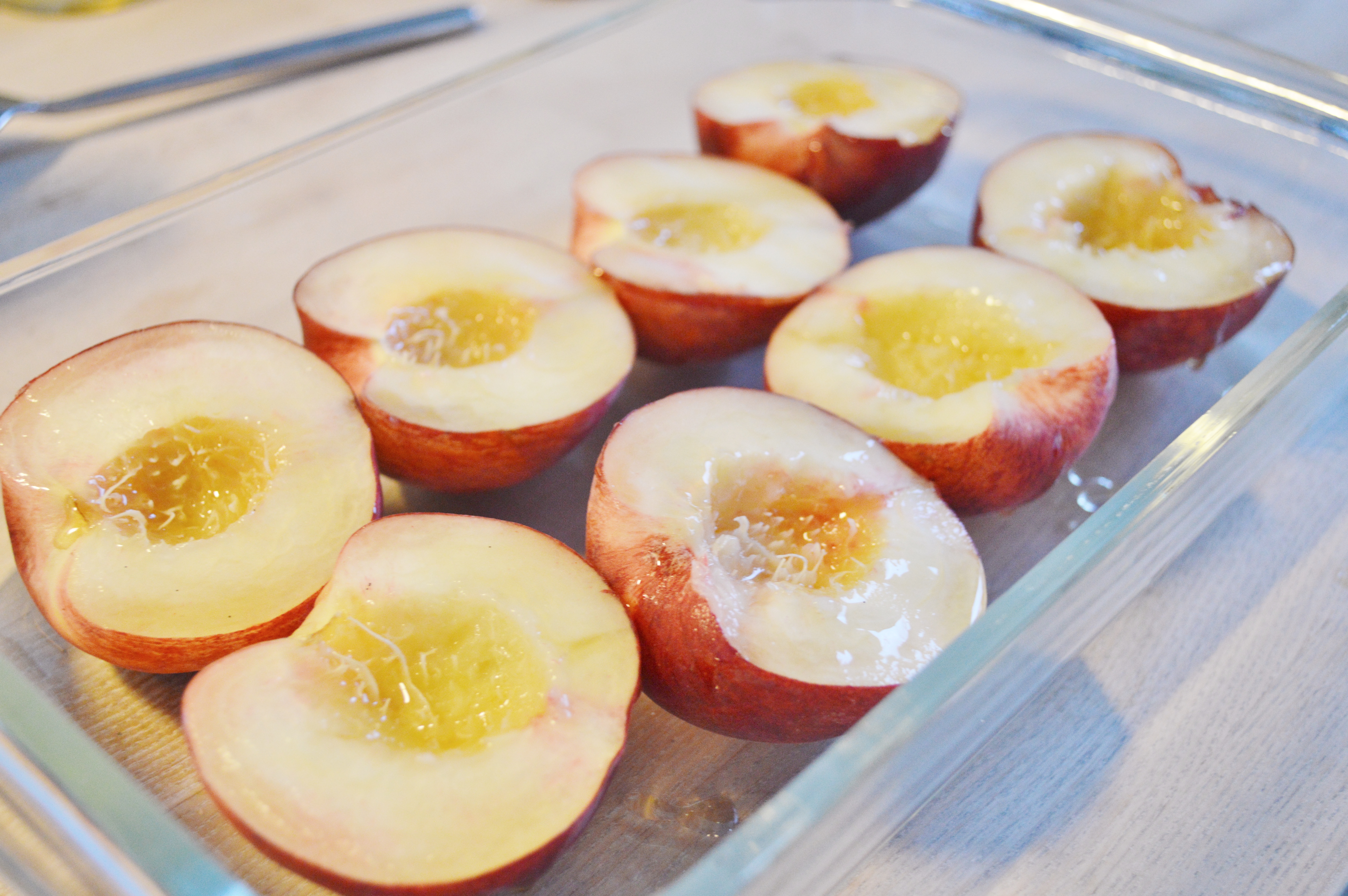 Wash the peaches and halve them. Remove the seeds and set into a baking pan. Drizzle with honey and grill in the oven for about 10-12 min. If your oven has it, use the grill function, otherwise set it to 200 degrees.