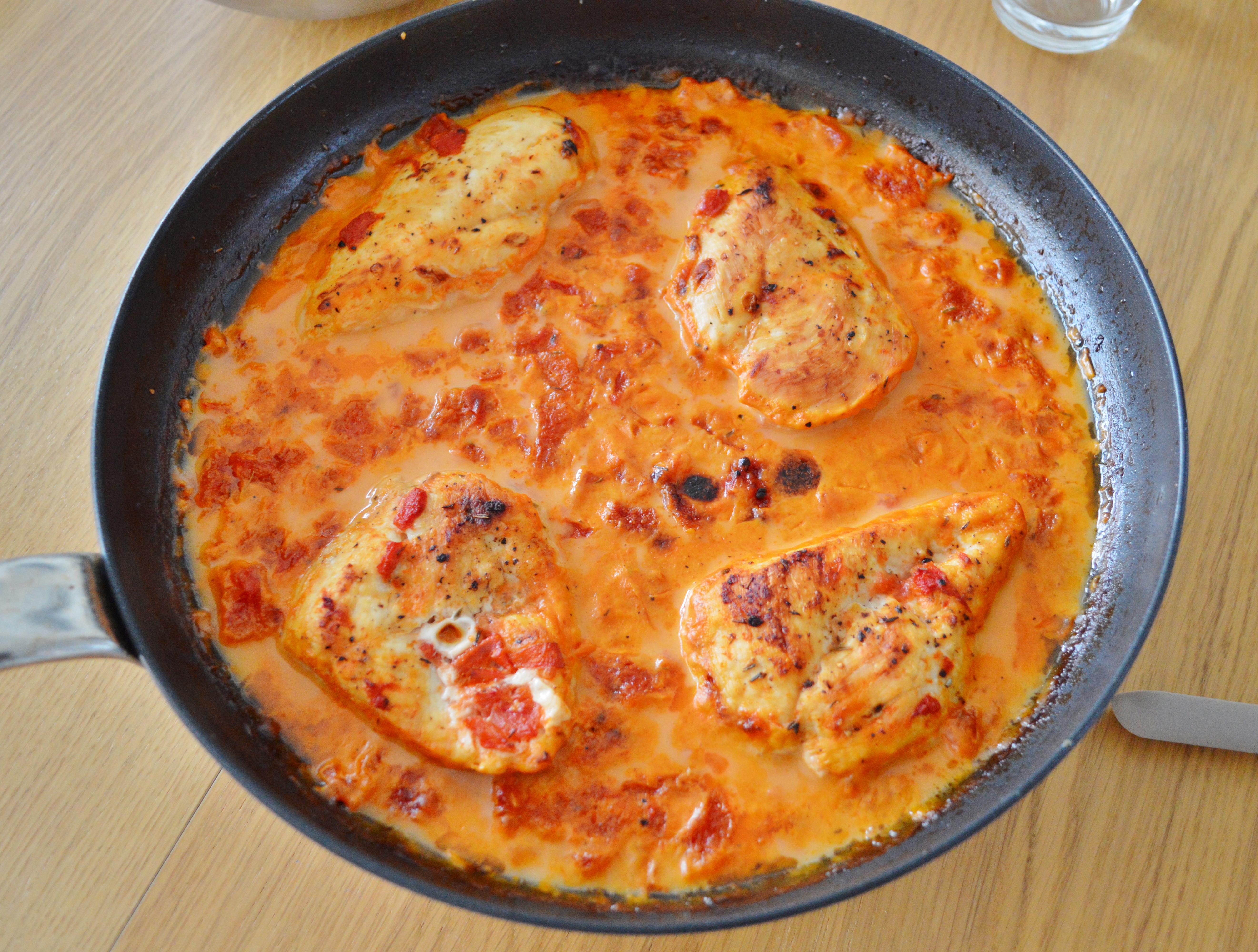 Don’t you know that feeling when you’re just hungry after work and don’t know what to make for dinner? It’s tempting to just order a pizza or other take-out, but really you’d like something good? Well, look no further. This is a recipe my mom once found somewhere and adapted it over the years, and it’s sooooo delicious! I’ve made this for guests, too, and people love it. Plus, it’s super simple to make! Just throw the ingredients together and pop it in the oven. It’s pan-fried chicken breasts in a creamy vermouth-tomato-sauce with thyme, but that was a bit too long to put in the title. Served over fresh tagliatelle, maybe with a green side salad – perfection.