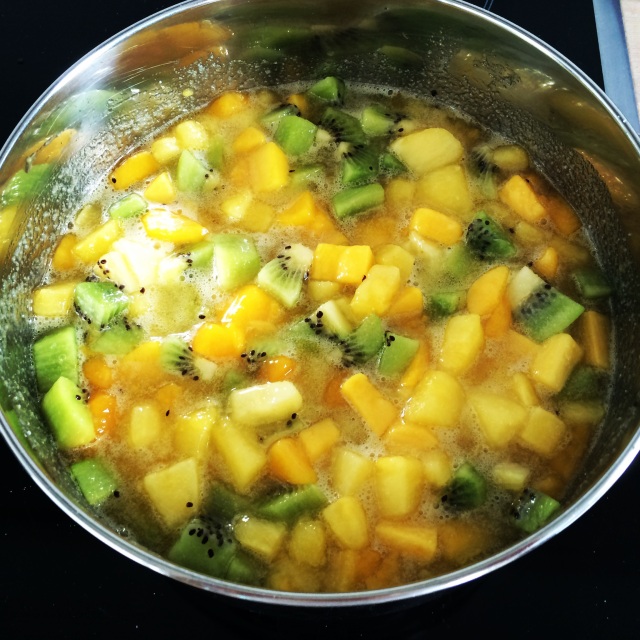 With all that free time on my hands, and inspired by the beautiful weather, I decided it was time to make something again! A nice give-away/ gift for the hosts for the family Easter brunch we’re attending tomorrow. So I decided on a nice jam. My first thought was strawberry-rhubarb (since I still have some rhubarb in the freezer), but I’d rather use fresh rhubarb when it is in season. So I decided on an exotic spring jam with mango, pineapple and kiwi, which turned out quite yummy!