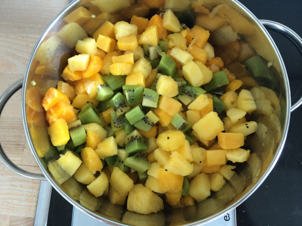 Peel the fruit and cut into small pieces. My kiwis were not overly ripe and therefore still a bit sour, which worked out well to even out the sweetness of the mango and sugar. If you use very ripe and sweet kiwis, maybe add some lemon or lime juice.