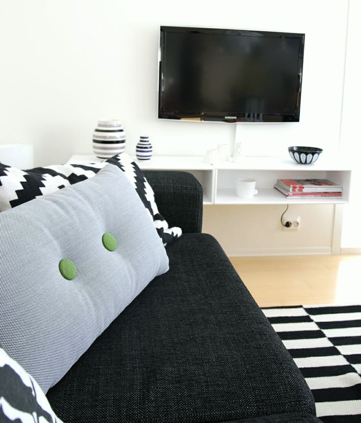 These HAY pillows exist in all kinds of colors, and I love how they can add a splash of color to an otherwise relatively monochromatic, black and white room. Below are some ideas for that.
